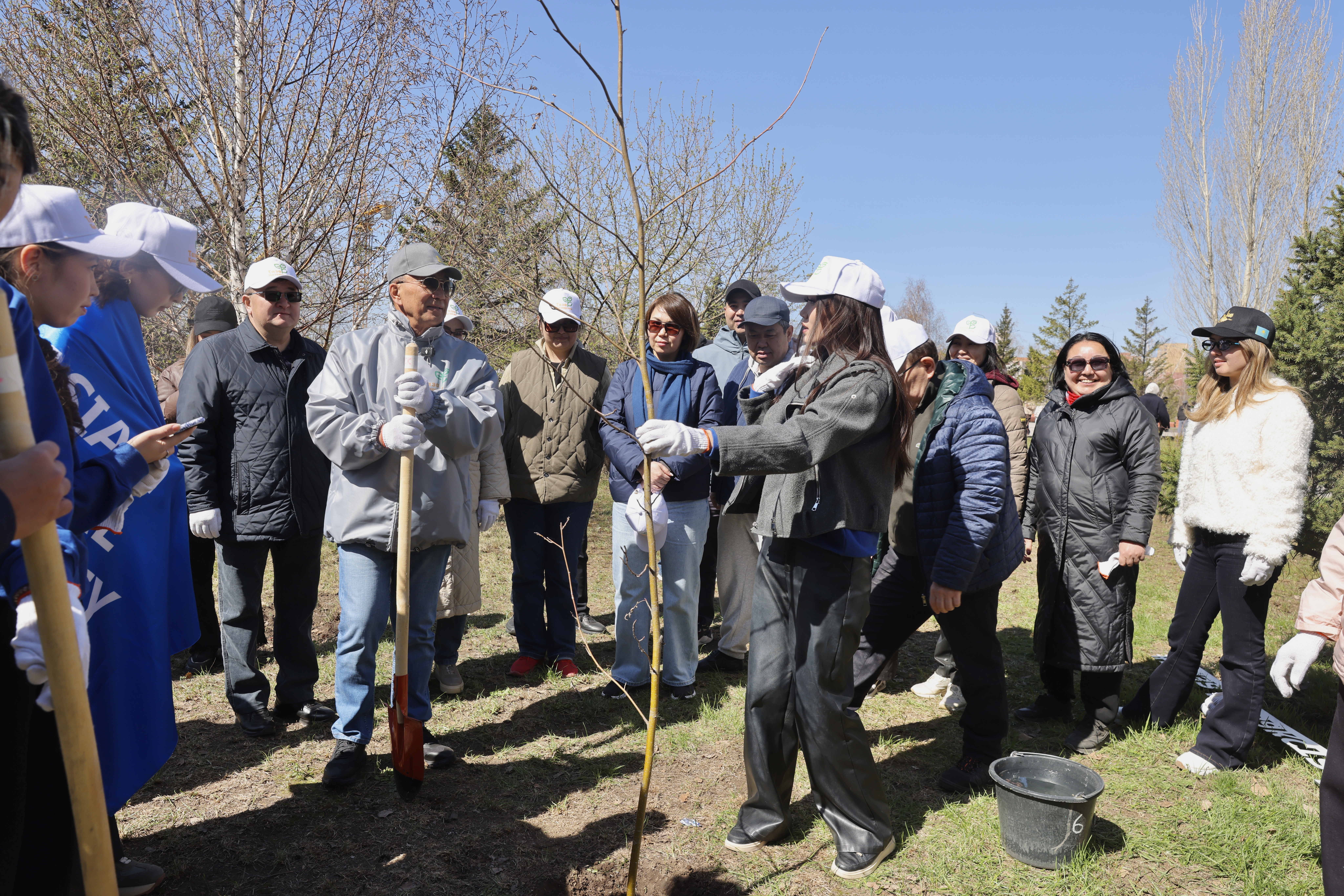 رەكتور ستۋدەنتتەر مەن ۋنيۆەرسيتەت قىزمەتكەرلەرىمەن بىرگە اعاش كوشەتتەرىن وتىرعىزىپ, قورشاعان ورتاعا ۇقىپتى قاراۋدىڭ ماڭىزىن جەكە ۇلگىسىمەن كورسەتتى.