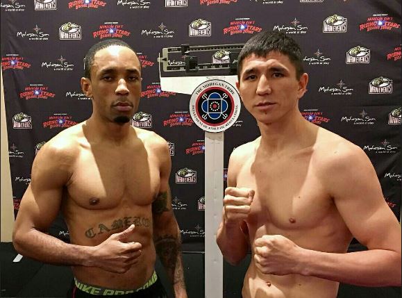 مەيىرىم نۇرسۇلتانوۆ (1-0) مەكسيكالىق حاۆەر ولۆەرامەن (1-0, 1 كو) التى راۋندقا سوزىلاتىن كەزدەسۋگە شىعادى. بوكسشىلار ورتا سالماق ليميتىنە لايىق بولدى (160 فۋنت - 72,6 كەلى). ال ەكىنشى وتانداسىمىز ماديار اشكەەۆ (7-0, 3 كو) امەريكالىق شون كەمەرونمەن (10-2, 5 كو) جۇدىرىقتاسادى. ەكەۋى دە ءبىرىنشى ورتا سالماققا لايىق بولدى (154 فۋنت - 69,9 كەلى). جەكپە-جەك سەگىز راۋندقا جوسپارلانعان.