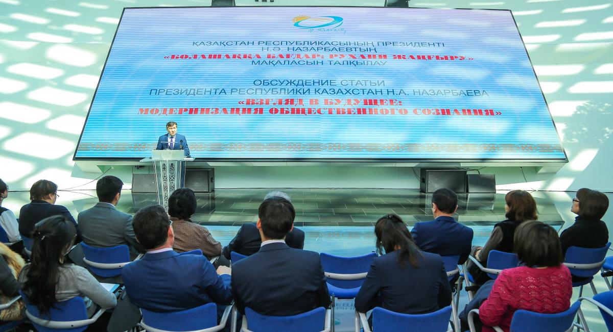 جيىندى ەلباسى كىتاپحاناسى ديرەكتورىنىڭ ورىنباسارى بەيسەمباي جۇمابەكوۆ اشتى. ال, ماقالاداعى نەگىزگى باسىمدىقتار مەن باعىتتار تۋرالى الەۋمەتتىك-اعارتۋشىلىق جوبالار قىزمەتىنىڭ جەتەكشى عىلىمي قىزمەتكەرى عازيز تەلەباەۆ اڭگىمەلەدى. «تەحنولوگيالىق جاڭعىرۋعا ارنالعان بيىلعى جولداۋدان جانە ساياسي جاڭعىرۋعا باعىتتالعان كونستيتۋتسيالىق رەفورمادان كەيىن ماڭىزدى قادام رۋحاني جاڭعىرۋ قولعا الىنباق. ەلباسىنىڭ ماقالاسىندا بەلگىلەنگەن ماقسات-مىندەتتەر – وتە وزەكتى. الماعايىپ الەم جىلدام ءوزگەرۋدە. وعان جۇدىرىقتاي جۇمىلعان ۇلت بولىپ بەيىمدەلۋىمىز كەرەك», دەگەن ع.تەلەباەۆ لاتىن الىپبيىنە كوشۋ, تۋعان جەردى كوركەيتۋ, گۋمانيتارلىق ءبىلىم بەرۋ, ءمادەنيەتتى زاماناۋي قالىپقا كەلتىرۋ, قۇندىلىقتاردىڭ بۇكىل قازاقستاندىق شەڭبەرىن قۇرۋ, ابىرويلى زامانداستاردى ارداقتاۋ – بارلىعى ناقتى تاپسىرمالارمەن ۇلاسۋى قاجەتتىگىن, ونى ىسكە اسىرۋعا ۋاقىت بەرىلگەنىن ايتتى. ول سونداي-اق, ۇلتتىق كودتى ساقتاۋ ارقىلى رۋحاني جاڭعىرۋ قاجەت دەگەن ماعىناداعى ەلباسى يدەياسىن باسشىلىققا الا وتىرىپ, بۇگىنگى زاماندا اعىلشىن ءتىلىن ءبىلۋدىڭ قاجەتتىلىگىنە توقتالدى. اسىرەسە, الىس-جاقىن شەت ەلدەرمەن بايلانىستاعى كىتاپحانا قىزمەتكەرلەرىنىڭ اعىلشىن تىلىندە سويلەي الۋى وزەكتى ەكەنىن جەتكىزدى. ال, ەلباسىنىڭ قوعامدا ۇلكەن رەزونانس تۋعىزىپ جاتقان لاتىن الىپبيىنە كوشۋ تۋرالى پىكىرى «كوشەمىز, كوشپەيمىز» دەپ تالقىلاناتىن ەمەس, ورىندالۋى ءتيىس شارۋا ەكەنىنە ماڭىز بەردى.