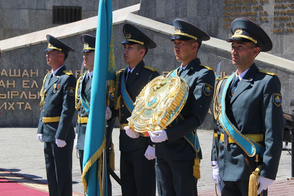 سالتاناتتى شارا 5518 اسكەري ءبولىمى وركەسترىنىڭ "ساعادات" مارشىمەن مەملەكەتتىك رامiزدەردى قارسى الۋىنان باستالدى.