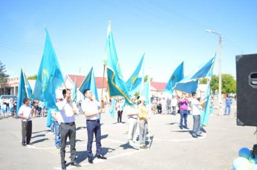 اۋدان جاستارى ۆەلو جارىسقا شىقتى. كوك تۋ كوتەرىپ, اۋدان ورتالىعىنداعى الاڭدا پاتريوتتىق شەرۋ جاساپ, وتان, تۋعان جەر جايلى اندەر شىرقادى.