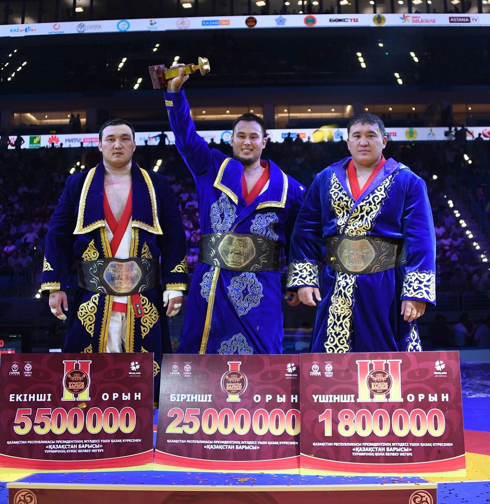 بۇدان بولەك, تۋرنيردە ەكىنشى جۇلدەگەر اتانعان ۇلان رىسقۇلعا «كۇمىس بەلبەۋ» مەن 5,5 ميلليون تەڭگە تاپسىرىلدى. ال ونىڭ باپكەرى 1,8 ميلليون تەڭگەنىڭ يەگەرى اتاندى. ءتۋرنيردىڭ ءۇشىنشى جۇلدەسىن جەڭىپ العان ايبەك نۇعىماروۆ «قولا بەلبەۋگە» قوسا 1,8 ميلليون تەڭگەنىڭ سەرتيفيكاتىنا يەلىك ەتتى. باپكەرى بولسا, 900 مىڭ تەڭگەنى جامباسقا باستى.
