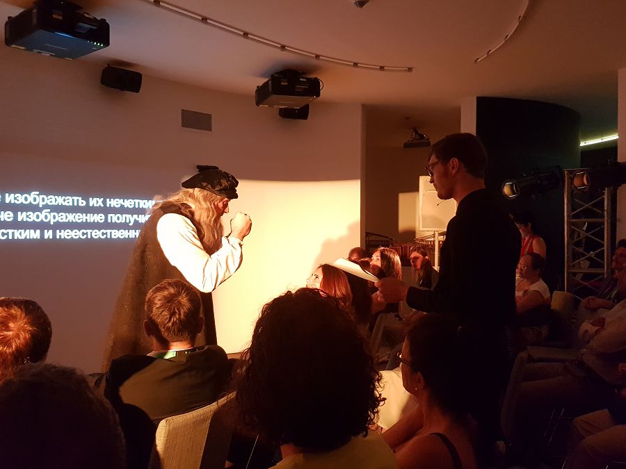 ەڭكىش تارتقان قارت لەوناردو ساحناعا شىعا كەلگەندە عاسىرلار قويناۋىنان ۇلى سۋرەتشى ءوزى ءتىرىلىپ كەلگەندەي ۋاقىت كەمەسى ءاپ-ساتتە تۇتاستىق الەمىنە سۇڭگىتىپ جىبەرگەندەي اسەردە قالدىق. قولىن قۋسىرا قارسى العان سۋرەتشى ادامدىق ار-نامىس, ادام ەركىندىگى, جاناشىرلىق تانىتۋ سەكىلدى اسىل قاسيەتتەردى قالىپتاستىرۋداعى جاڭا ىزدەنىسكە بەت بۇرۋ تۋرالى شابىتتانا سويلەدى. «جاقسى وتكەن كۇن تىنىش ۇيىقتاۋعا, جاقسى ءومىر ءسۇرۋ تىنىش ولۋگە مۇرسات بەرەدى» دەگەن قارت دۇنيەتانىمدىق كوزقاراس تۇرعىسىندا شەشىلە سويلەدى.