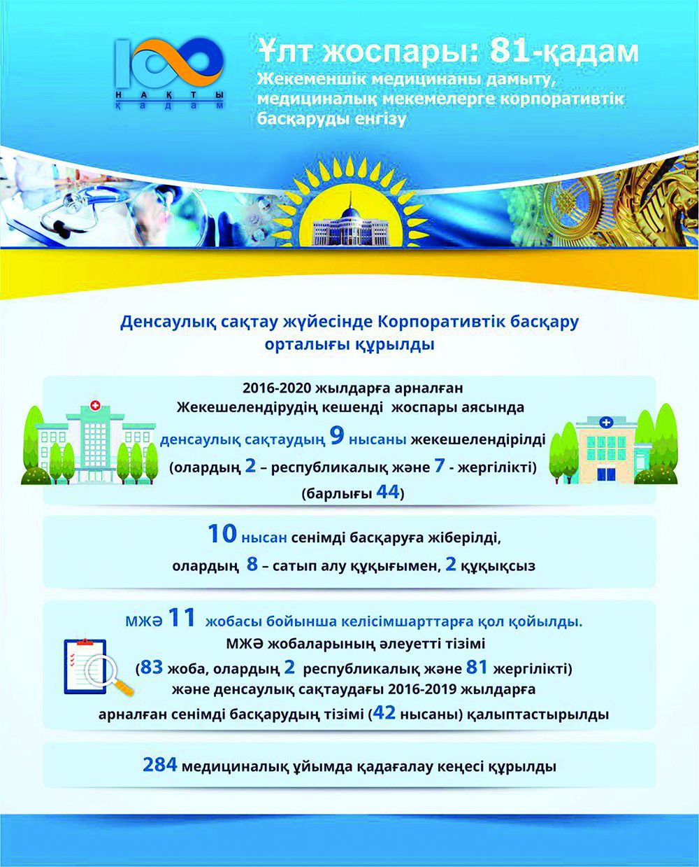 جەكەمەنشىك مەديتسينانى دامىتىپ, مەديتسينالىق مەكەمەلەرگە كورپوراتيۆتىك باسقارۋدى ەنگىزۋ ءۇشىن ەلىمىزدىڭ دەنساۋلىق ساقتاۋ سالاسىندا كوپتەگەن وزگەرىس قولعا الىنا باستادى.