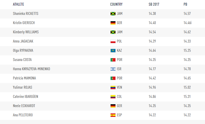 ايتپاقشى, فينالدا باق سىنايتىن 12 قىزدىڭ ءتىزىمى – تومەندەگىدەي. ءۇشىنشى باعاندا ارقايسىنىڭ 2017 جىلعى ەڭ ۇزدىك كورسەتكىشتەرى, ال سوڭعى باعاندا جەكە رەكوردتارى تۇزىلگەن: