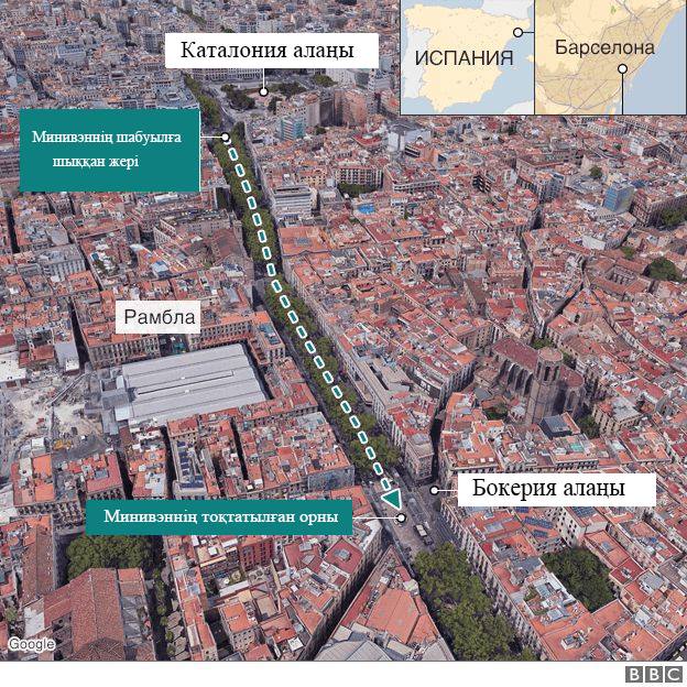 جەرگىلىكتى ۋاقىت بويىنشا 16:50-دە (استانا ۋاقىتى بويىنشا 20:50) شابۋىل جاسالدى. جۇك كولىگى كاتالونيا الاڭى جاقتان ادام تولى رامبلا بۋلۆارىنا شىقتى. ورتالىق بۋلۆاردىڭ ۇزىندىعى 1,2 كم. بۇل الاڭ تۋريستەر اراسىندا ءوزىنىڭ بازار دۇكەندەرى مەن شاعىن رەستوراندارىمەن تانىمال.
