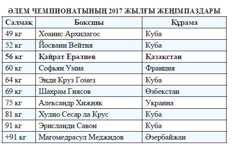 ءار نارسەنىڭ پارقى سالىستىرعاندا بىلىنەدى. ماسەلەن, قۇرامانىڭ وسىدان ەكى جىل بۇرىن, ياعني 2015 جىلى دوحادا (قاتار) وتكەن الەم چەمپيوناتىنداعى ناتيجەسى تۇرعىسىنان العاندا, العا باسقان قادامىمىز ارشىندى بولدى. دوحادا ءبىزدىڭ بوكسشىلارعا ەكى-اق جۇلدە بۇيىرعان بولاتىن. دانيار ەلەۋسىنوۆ (69 كگ) پەن يۆان دىچكو (+91 كگ) فينالدىق جەكپە-جەكتەرىندە جەڭىلىپ, كۇمىس مەدالعا قاناعات ەتكەن ەدى.