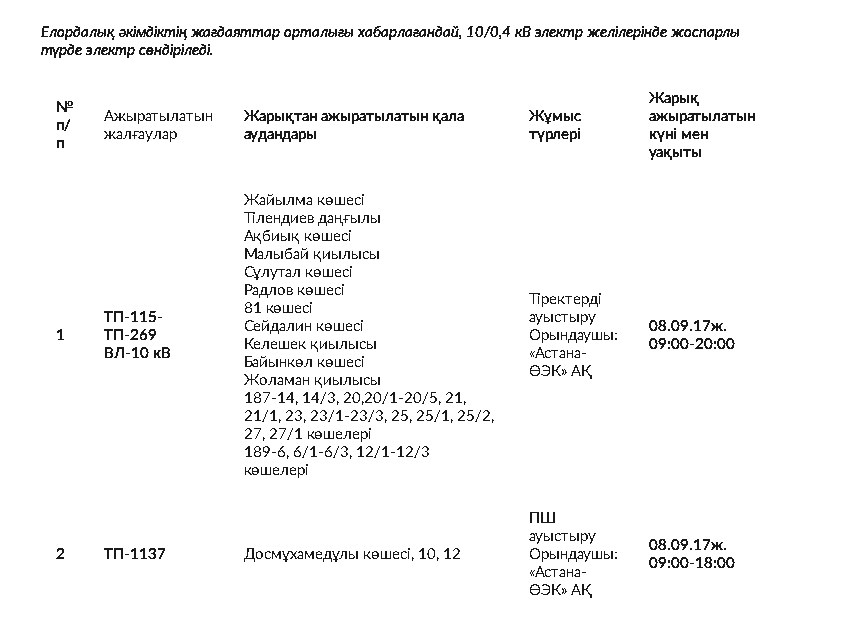 «استانا-وڭىرلىك ەلەكتر كومپانياسى» اق بۇل كۇنى تاڭەرتەڭگى ساعات 9-دان باستاپ, ءارتۇرلى ۋاقىتقا جارىقتى ءسوندىرىپ, دىڭگەكتەردى اۋىستىرۋ, ەسەپتەۋ قۇرالدارىن ورناتۋ, كابەل جەلىلەرىن قوسۋ جانە باسقا دا جۇمىستاردى جۇرگىزەتىن بولادى.