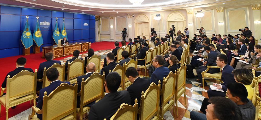 جيىنعا 50-دەن استام قازاقستاندىق جانە شەتەلدىك بۇقارالىق اقپارات قۇرالدارىنىڭ وكىلدەرى قاتىستى. وندا مەملەكەت باسشىسى ەلىمىزدە وتكەن حالىقارالىق ءىس-شارالاردى قورىتىندىلاپ, جۋرناليستەر تاراپىنان قويىلعان سۇراقتارعا جاۋاپ بەردى.