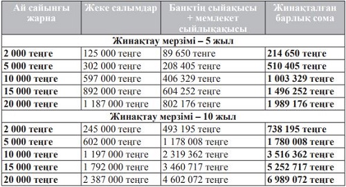 كورنەكىلىك ءۇشىن اي سايىنعى جارنالار ءارتۇرلى بولعانداعى جيناقتاۋدىڭ ۇلگى ەسەپتەرىن الىپ كورەلىك. مىسالى, باستاپقى جارنا 7000 تەڭگە, بانكتىڭ پايىزى 13,5%, مەملەكەت سىيلىقاقىسى 5% بولعاندا: