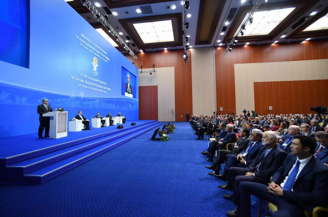 فورۋمنىڭ اشىلۋ سالتاناتىندا سەنات توراعاسى قاسىم-جومارت توقاەۆ پرەزيدەنت نۇرسۇلتان نازارباەۆتىڭ شاراعا قاتىسۋشىلارعا ارناعان قۇتىقتاۋىن وقىپ بەردى. مەملەكەت باسشىسىنىڭ قۇتتىقتاۋىندا مگيمو-عا ءوز ەلىنىڭ ومىرىندە ماڭىزدى ءرول اتقاراتىن كورنەكتى ساياسي جانە قوعامدىق قايراتكەرلەر, ديپلوماتتار, جۋرناليستەر, كاسىپكەرلەردىڭ تۇتاس ءبىر شوعىرىنىڭ قاراشاڭىراعى رەتىندە جوعارى باعا بەرىلدى. قازاقستان پرەزيدەنتى جەر جۇزىندەگى ساياساتتىڭ, ەكونوميكاداعى جانە قوعامدىق ومىرىندەگى كۇشەيە تۇسكەن دۇربەلەڭدەر اياسىندا حالىقارالىق سالا ماماندارىنىڭ جاۋاپكەرشىلىگى مەن ءرولى ارتا تۇسكەنىن اتاپ ءوتتى.