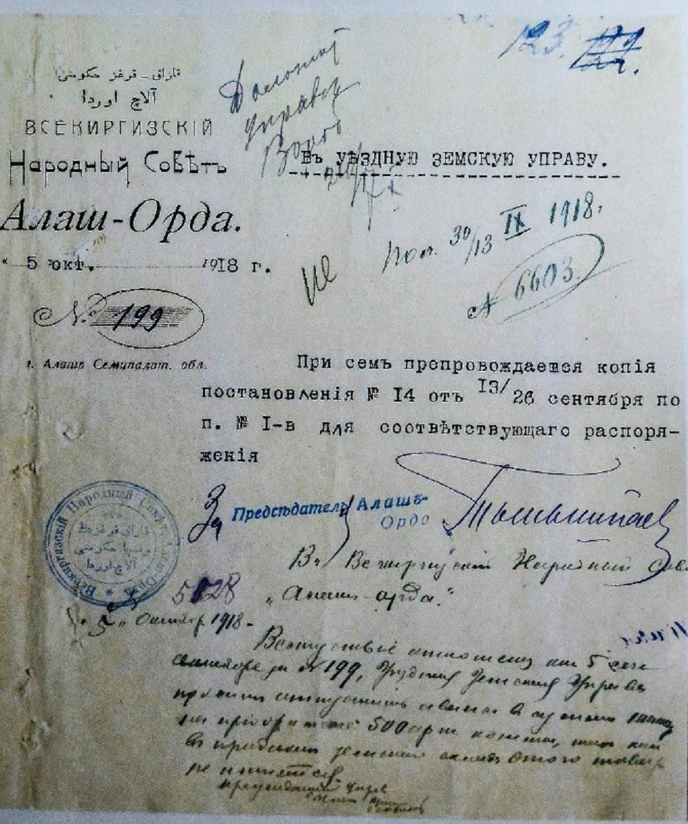 "الاشوردا" حالىقتىق كەڭەسىنىڭ حاتى. 1918 جىل