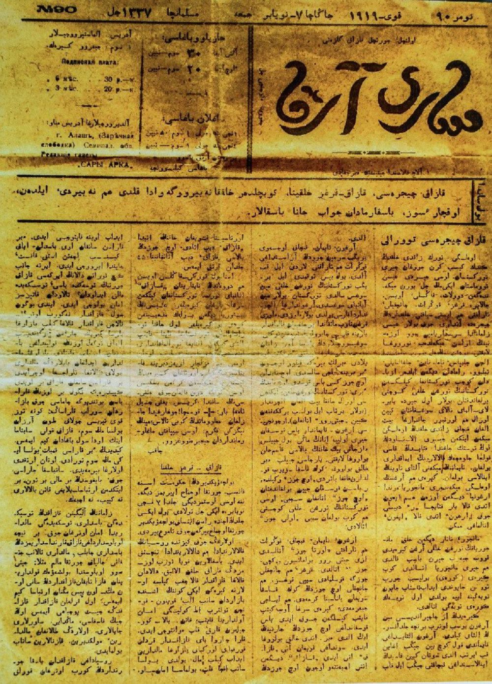 "سارىارقا" گازەتىنىڭ 1919 جىلعى سانى