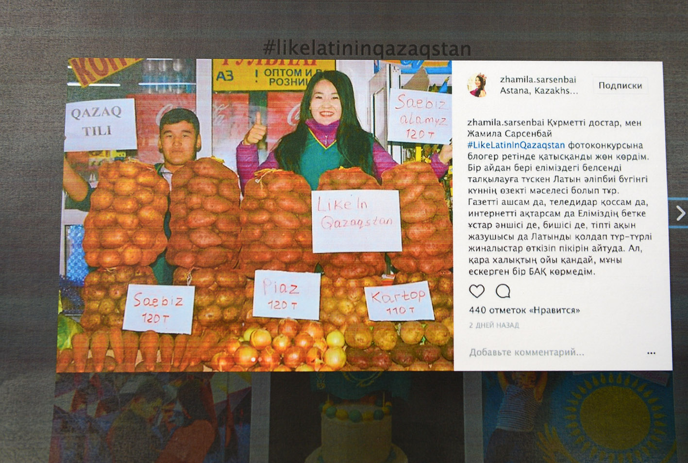 قازاق ءتىلىن كيريلليتسادان لاتىن تىلىنە كوشىرۋدى قولداۋعا باعىتتالعان حالىقارالىق فوتو-ناۋقانعا ينتەرنەت قولدانۋشىلارى 300 دەن استام سۋرەت جىبەرىپ, 25 000 رەت ۇناتۋ باتىرماسىن باسقان.