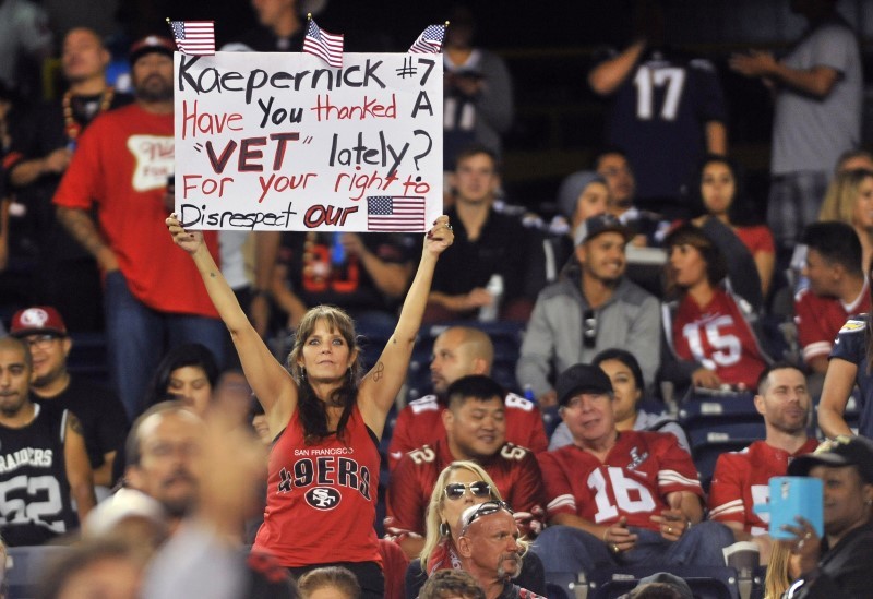 The 49ers پەن The Chargers كوماندالارى اراسىنداعى ويىن كەزىندە كولين كاپەرنيككتىڭ ءانۇران كەزىندە تىزە بۇگۋىن ايىپتايتىن قاعاز ۇستاعان سان-فرانتسيسكولىق كوماندانىڭ فاناتى. 1 قىركۇيەك, 2016 ج. سان ديەگو, كاليفورنيا. سۋرەت: Orlando Ramirez-USA TODAY Sports