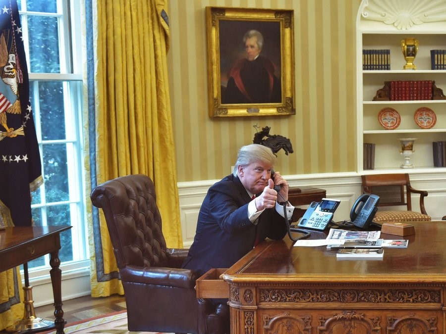 پرەزدەنت ترامپ اق ۇيدەگى جۇمىس كابينەتىندە تەلەفونمەن سويلەسىپ وتىرىپ, باس بارماعىن جوعارى كوتەرۋدە. سۋرەت: Mandel Ngan/AFP/Getty Images