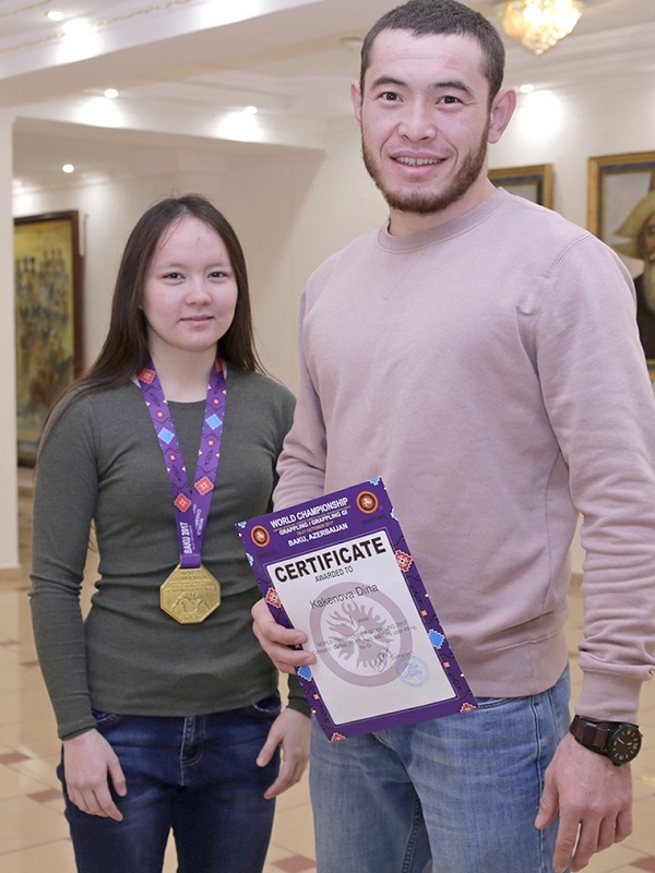 دينا دجيۋ-دجيتسۋ بويىنشا حالىقارالىق دارەجەدەگى سپورت شەبەرى, قارا جانە كوك بەلبەۋ يەگەرى, پاۆلودار مەملەكەتتىك ۋنيۆەرسيتەتىنىڭ بەلدى جاتتىقتىرۋشىسى زايربەك ابىلقادىروۆتا جاتتىعادى.