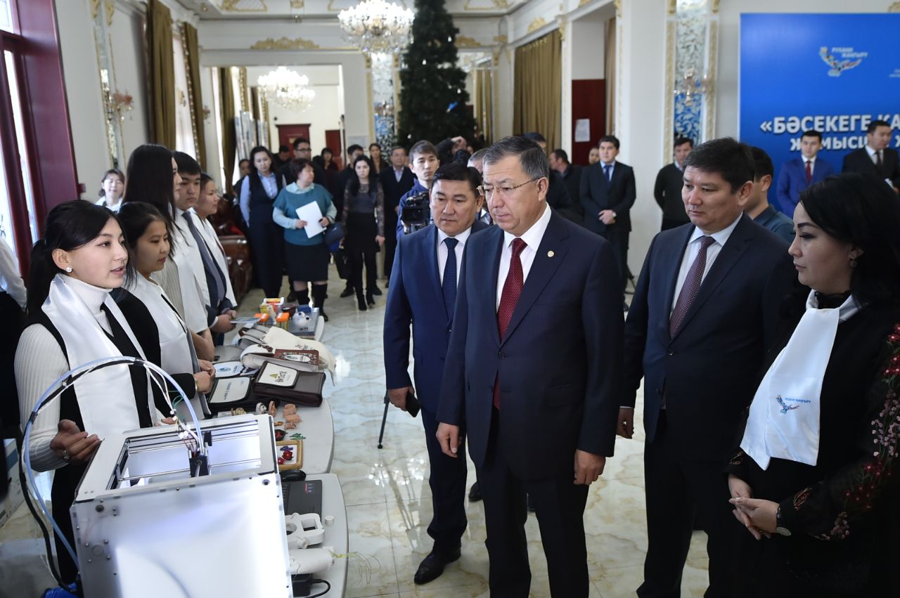 فورۋم جۇمىسىنا ارنايى قاتىسقان وبلىس اكىمى جانسەيىت تۇيمەباەۆ جاس مامانداردىڭ يننوۆاتسيالىق جوبالارى مەن IT-تەحنولوگياسىنا ارنالعان قۇرالدار كورمەسىن تاماشالاپ, ەڭبەكشى جاستارمەن تىلدەستى.