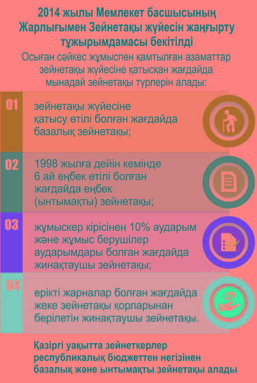 وسى جايتتى ەسكەرە وتىرىپ, مەملەكەت ازاماتتاردىڭ 1998 جىلعى 1 قاڭتارعا دەيىنگى ەڭبەك ءوتىلى ءۇشىن ەڭبەك زەينەتاقىسىن تولەۋ ءتارتىبىن ساقتاپ قالدى. بۇعان قوسىمشا زەينەتكەرلەردى الەۋمەتتىك قولداۋدى ودان ءارى كۇشەيتە ءتۇسۋ ماقساتىندا 2005 جىلدان باستاپ بازالىق زەينەتاقى ەنگىزىلدى. بۇگىندە زەينەتاقىنىڭ بۇل ءتۇرىن 2 ملن-نان اسا زەينەتكەر الىپ كەلەدى. بىلتىر زەينەتاقى تولەۋ ءۇشىن مەملەكەتتەن 1,6 ترلن تەڭگە جۇمسالدى. جىل سايىن زەينەتاقى مولشەرىن ارتتىرىپ كەلەمىز. وتكەن جىلى ەڭ تومەنگى زەينەتاقى مولشەرى – 46 مىڭ تەڭگە, ال ورتاشا زەينەتاقى مولشەرى 66 مىڭ تەڭگە بولدى. تمد ەلدەرى اراسىندا جوعارى دەڭگەيدە ەكەنىن اتاپ وتكىم كەلەدى. ال جۇمىس بەرۋشىلەر 2014 جىلدان باستاپ قاۋىپتى جۇمىستا ىستەيتىن 425 مىڭنان استام قىزمەتكەرىنە 5% كاسىپتىك جارنالاردى تولەي باس-