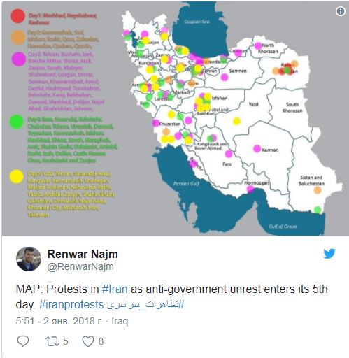 يرانداعى نارازىلىق اكتسيالارى 28 جەلتوقسان كۇنى مەشحەد قالاسىندا باستالدى. 29 جەلتوقسان كۇنى رەشت, كەرمانشاح, شيرازە, يسفاحان, حامادان قالالارىندا دا ميتينگىلەر ءوتتى. 30 جەلتوقسان كۇنى تەگەران قالاسىنداعى تەگەران ۋنيۆەرسيتەتىنىڭ الدىندا جانە رەۆوليۋتسيا الاڭىندا دا حالىق نارازىلىق اكتسيالارىنا شىقتى.