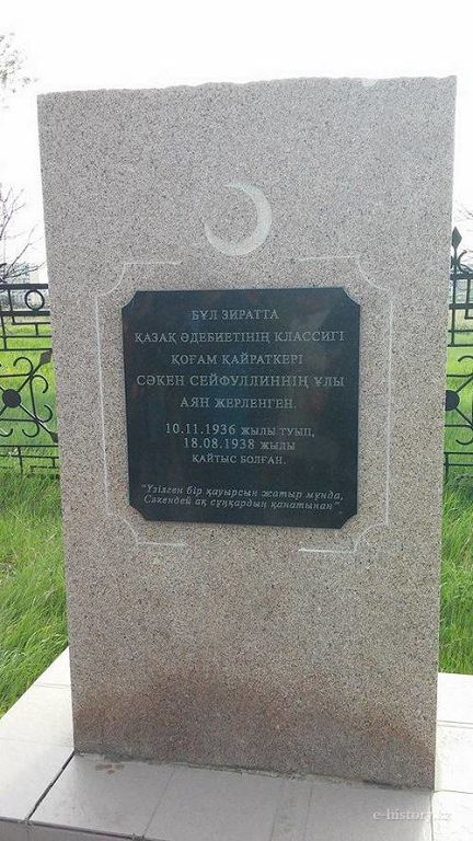 بىردە ول ىسساپارمەن كوكشەتاۋعا ات باسىن تىرەيدى. جۇمىسىن بىتىرگەن سوڭ, سونداعى مۇسىلمان زيراتىنداعى ارۋاقتارعا قۇران وقۋعا بارادى. كىرەبەرىستەگى جول باستاۋشى قارت مۇندا وڭىردەگى كوپتەگەن اياۋلى جانداردىڭ ماڭگىلىككە دامىلداپ جاتقانىن حاباردار ەتە كەلىپ, ولاردىڭ اراسىندا ساكەن سەيفۋلليننىڭ ۇلى اياننىڭ دا بار ەكەنىن ايتادى. قۋات ەسىمحان ۇلى بۇل جايدى اقىننىڭ جارى گۇلباھرامنىڭ جازىپ قالدىرعان ەستەلىك حاتىنان بىلەتىن. وندا اپاي ساكەن ۇستالىپ, ەش حابار بولماعان سوڭ قىزىلجارداعى تۋىستارىنا بارىپ, ودان كوكشەتاۋعا كەلە جاتقانىن باياندايدى. قولىندا ءال ۇستىندەگى ۇلى ايان بار ەكەن. ءسابي جول ۇستىندە شەتىنەيدى. جولسەرىككە ايتسا, كەزەكتى ستانسادان ءتۇسىرىپ تاستاۋى مۇمكىن. سوندىقتان جانسىز بالاسىن ەمىزگەندەي بولىپ وتىرىپ, كوكشەتاۋعا جەتەدى. تانىس تاتار كەمپىردىڭ ءۇيىن تاۋىپ, سول ءاني ەكەۋى پەرزەنتىن زيراتقا تۇندەلەتىپ جەرلەيدى. حاتتا بار جاعداي وسىلاي دەپ ايتىلعان. سول ەسىنە تۇسكەن كەيىپكەرىمىز كوپ كەشىكپەي مۇندا قايتا ورالىپ, ءجون بىلەتىن ۇلكەندەردىڭ قاتىسۋىمەن اسىلدىڭ سىنىعى, قىراننىڭ قيىعى, عايىپ قۇسى ايانعا قۇران باعىشتايدى. اس بەرىپ, باسىنا بەلگىتاس قويادى. وعان اقىن نەسىپبەك ايت ۇلى شىعارعان: «ۇزىلگەن ءبىر قاۋىرسىن جاتىر مۇندا, ساكەندەي اقسۇڭقاردىڭ قاناتىنان», دەگەن سوزدەردى قاشاپ جازدىرتادى.