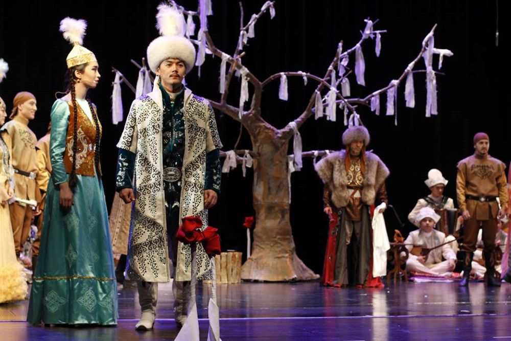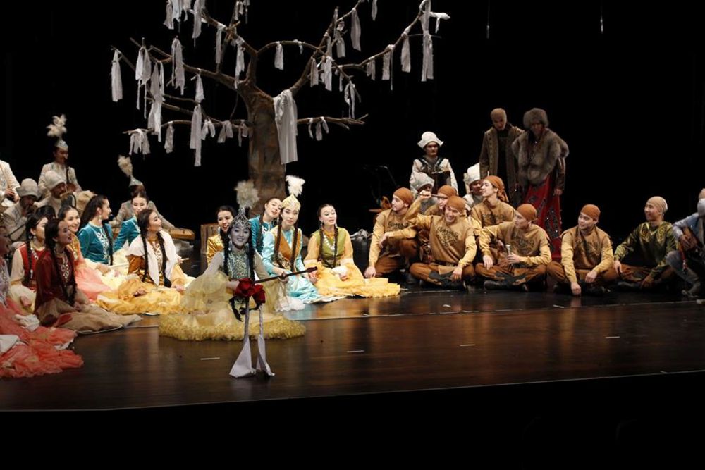 شىمىلدىق اشىلعان مەزەتتە قىلقوبىزدىڭ سارىنىمەن قازاق دالاسىن كوز الدىڭا ەلەستەتەتىن «استانا سازى» ءانسامبلىنىڭ ءارتىسى ايان وماروۆتىڭ ورىنداۋ شەبەرلىگىنە ءتانتى بولماسقا شاراڭ جوق. ءانسامبلدىڭ بارلىق ورىنداۋشىلارىنىڭ ساحناعا شىعار الدىندا, ارەرستسەنادا ورنالاسقان «تىلەك اعاشى» نەمەسە «سەنىم سيمۆولى» سانالاتىن ماۋەلى بايتەرەككە شۇبەرەك بايلاۋى ساحناعا, ءوز حالقىنىڭ مادەني مۇراسىنا ادالدىعىن دالەلدەيتىن كورىنىستەي سەزىلدى. زارلى داۋىسى قوبىز سارىنىمەن ۇندەسە ورىلگەن قازاقستاننىڭ ەڭبەك سىڭىرگەن قايراتكەرى سايلاۋ قاميەۆتىڭ جىراۋلىق ونەرىنەن باستاۋ العان «قىز جىبەك» ەتنو-فولكلورلىق ميۋزيكلىنىڭ كوركەمدىك ۇلگىسى, دالا تەاترىنىڭ ەلەمەنتتەرى نەگىزىندە جانر تابيعاتىنا ساي ايشىقتى بەزەندىرىلۋى ارتىستەردىڭ شىنايى شەبەرلىگىمەن ەركىن قابىسىپ تۇردى. «استانا سازى» ءانسامبلىنىڭ سۇيەمەلدەۋىمەن ساحنادان ەسكەن تابيعي ءۇن, عاجاپ مۋزىكا جۇرتشىلىقتى ايرىقشا ءبىر ادەمى اسەرگە, عاجاپ ءبىر شاتتىققا بولەدى. اق ماتامەن اۆانستسەنانى جاۋىپ, باياۋ جىلجىپ بارا جاتقان جىراۋ مەن تۇيەلەر كوشى (قۋىرشاق تەاترىنىڭ ەلەمەنتتەرى پايدالانىلعان) عاسىرمەن بىرگە كوشىپ بارا جاتقانداي اسەر قالدىرادى.