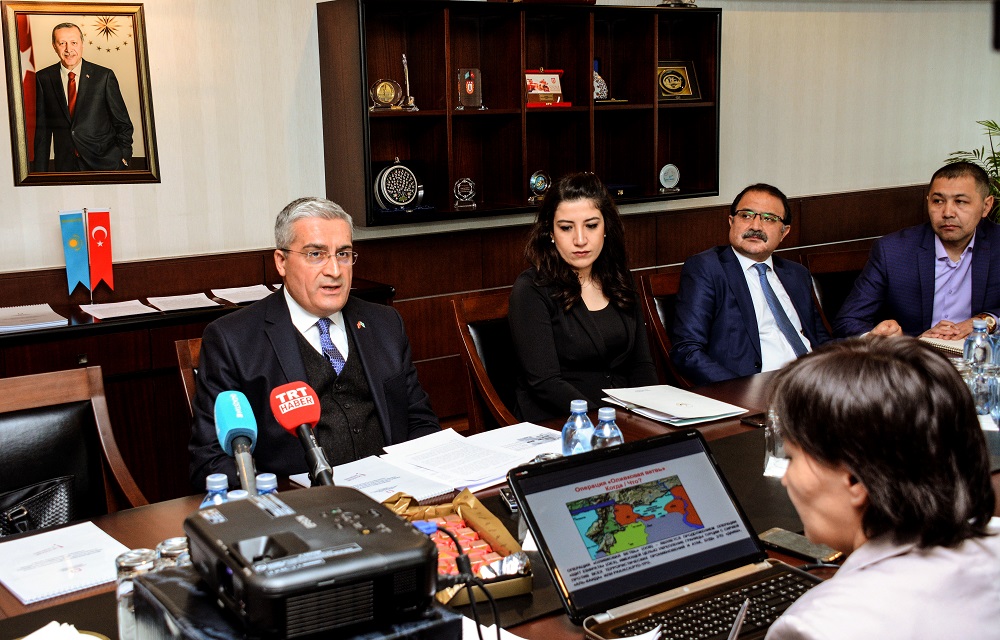 ديپلومات سيريا داعدارىسى باستالعاننان بەرى تۇركيانىڭ ۇستانىمىنان اينىماي, ەلگە كومەك قولىن سوزىپ كەلە جاتقانىن اتاپ ءوتتى. قازىرگى تاڭدا ەلدەگى جاعدايى رەتتەۋ ءۇشىن جەنەۆا كەلىسسوزدەرىنە, استانا پروتسەسىنە كەپىل-مەملەكەت رەتىندە قاتىسىپ وتىرعانىنا دا توقتالدى. سيريادان بوسقان 3,5 ميلليون حالىق تۇركيادا باس ساۋعالاپ جۇرگەنىن دە ءسوز ەتتى. ەلشىنىڭ ايتۋىنشا, ء«زايتۇن بۇتاعى» وپەراتسياسى كەزىندە بەيبىت تۇرعىندار مەن ءدىني ورىندار, مادەني نىساندار, تاريحي جانە ارحەولوگيالىق ەسكەرتكىشتەرگە زاقىم كەلتىرمەۋ ءۇشىن ساقتىق شارالارى قاراستىرىلعان.