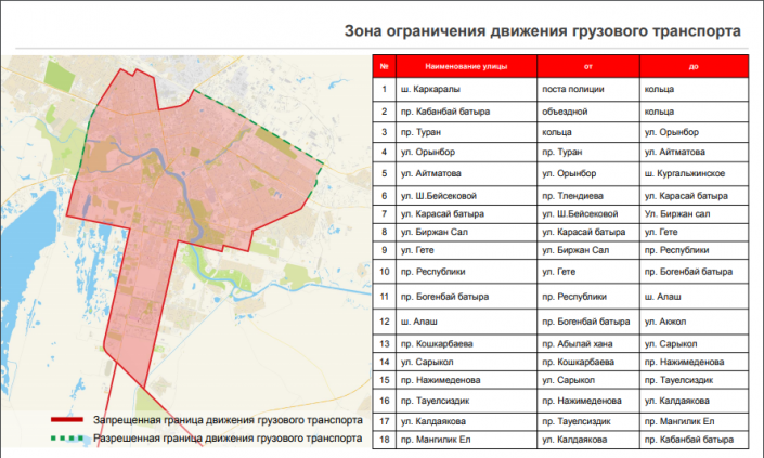شەكتەۋ 14 مامىردا جۇمىس كۇندەرى ساعات 07.00-دەن 09.00-گە دەيىن جانە 17.30-دان 20.00-گە دەيىن اۆتوموبيل جولدارى شەكارالارىنىڭ ايماعىندا سالماعى 3,5 توننادان ارتىق جۇك كولىكتەرىنىڭ قوزعالىسىنا ەنگىزىلەدى. ول 31 جەلتوقسانعا دەيىن قويىلىپ وتىر. ەلوردا اكىمدىگى مۇنداي شەكتەۋلەردى حالىقارالىق "ەكسپو-2017" كورمەسىن وتكىزۋ كەزىندە قولداندى. ول كەزدە قالانىڭ بەلگىلى ءبىر ۋچاسكەلەرىنە جۇك كولىگىنىڭ كىرۋىنە ساعات 6:00-دەن 23:00-گە دەيىن شەكتەۋ قويىلعان بولاتىن.