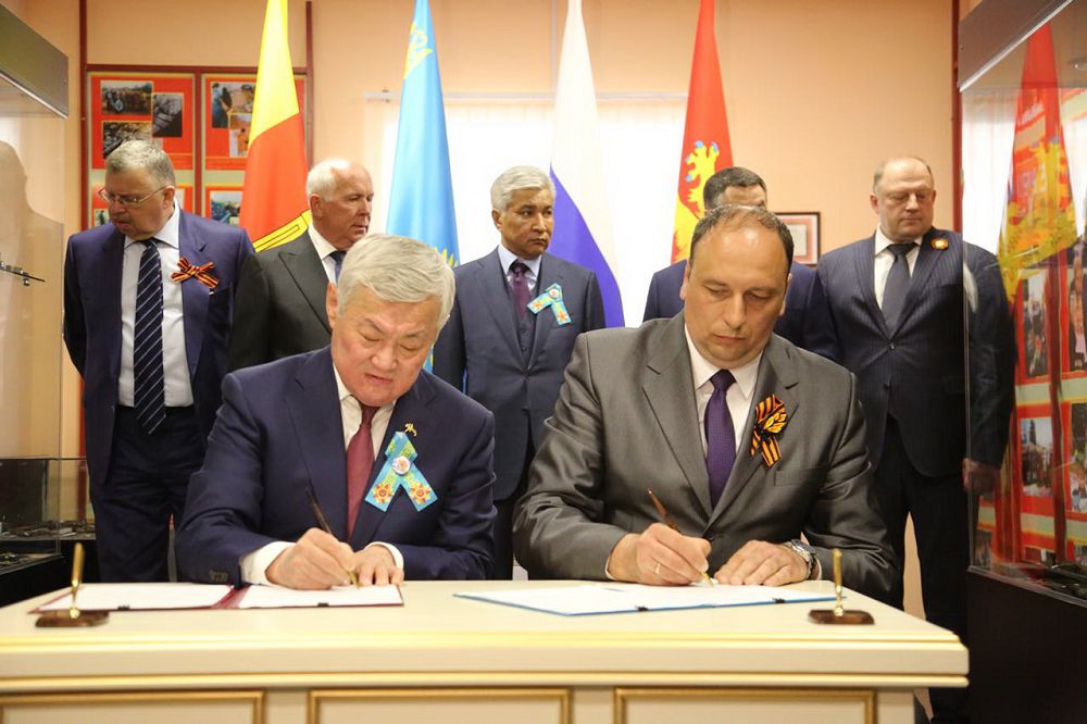 ...رجەۆ جەرىندە جەڭىس مەرەكەسى قارساڭىندا بولعان قاۋىشۋ مەن جۇزدەسۋ قورىتىندىسىندا №100 جانە №101 قازاقستاندىق اتقىشتار بريگاداسىنىڭ قازا تاپقان جاۋىنگەرلەرىنە قويىلعان مەموريالدىق كەشەندى رجەۆ قالاسىنىڭ مۋنيتسيپيالدىق مەنشىگىنە ەنگىزۋ جونىندەگى ەكىجاقتى كەلىسىمگە قول قويىلدى.