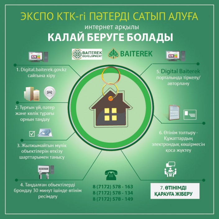 "تۇرعىن ءۇيدى جانە ماشينا ورىندارىن ساتىپ الۋعا وتىنىمدەر قابىلداۋ پروتسەسى ونىڭ ايقىندىلىعىن قامتاماسىز ەتۋ ماقساتىندا "Digital Baiterek" پلاتفورماسى ارقىلى ونلاين رەجيمدە جۇزەگە اسىرىلاتىن بولادى. "بايتەرەك دەۆەلوپمەنت" اق ريەلتورلىق كومپانيالارمەن ىنتىماقتاستىق جاسامايتىنىنا جانە پورتال ارقىلى وتىنىمدەردى تىركەۋ جانە رەسىمدەۋ ءۇشىن تولەماقى المايتىنىنا الەۋەتتى ساتىپ الۋشىلاردىڭ نازارىن ايرىقشا اۋدارعىمىز كەلەدى", - دەدى وسەرباەۆ.