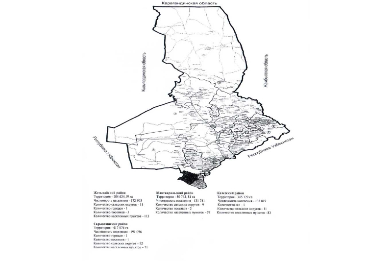 ماسەلەن, سارىاعاش اۋدانىنىڭ اۋماعى 417074 گەكتاردى قۇرايدى, شەكارالارى مىناداي بولىپ بەلگىلەنگەن: سولتۇستىك شەكاراسى وڭتۇستىك قازاقستان وبلىسى ارىس قالاسى مەن قازىعۇرت اۋدانىنىڭ اكىمشىلىك باعىنىسىنداعى اۋماقتاردىڭ قولدانىستاعى شەكارالارى بويىنشا وتەدى; شىعىس شەكاراسى وڭتۇستىك قازاقستان وبلىسى قازىعۇرت اۋدانىنىن, قولدانىستاعى شەكاراسى بويىنشا جانە وزبەكستان رەسپۋبليكاسى تاشكەنت وبلىسى قىبراي اۋدانىمەن شەكتەسەتىن زاح كانالى ارناسى بويىنشا وتەتىن قازاقستان رەسپۋبليكاسىنىڭ مەملەكەتتىك شەكاراسى ارقىلى وتەدى; وڭتۇستىك شەكاراسى وزبەكستان رەسپۋبليكاسى تاشكەنت وبلىسى قىبراي, تاشكەنت, زانگي اتا اۋداندارىمەن شەكتەسەتىن كەلەس وزەنى ارناسى بويىنشا وتەتىن قازاقستان رەسپۋبليكاسىنىڭ مەملەكەتتىك شەكاراسى اقىلى جانە ودان ءارى وڭتۇستىك قازاقستان وبلىسى قۇرامىندا قۇرىلاتىن كەلەس اۋدانىنىڭ بىرتىلەك, وشاقتى, بىرلىك, جامبىل, بوزاي اۋىلدىق وكرۋگتەرىنىڭ قولدانىستاعى شەكارالارى ارقىلى وتەدى; باتىس شەكاراسى وڭتۇستىك قازاقستان وبلىسى شاردارا اۋدانىمەن شەكتەسەتىن سىرداريا وزەنى ارناسى ارقىلى وتەدى.