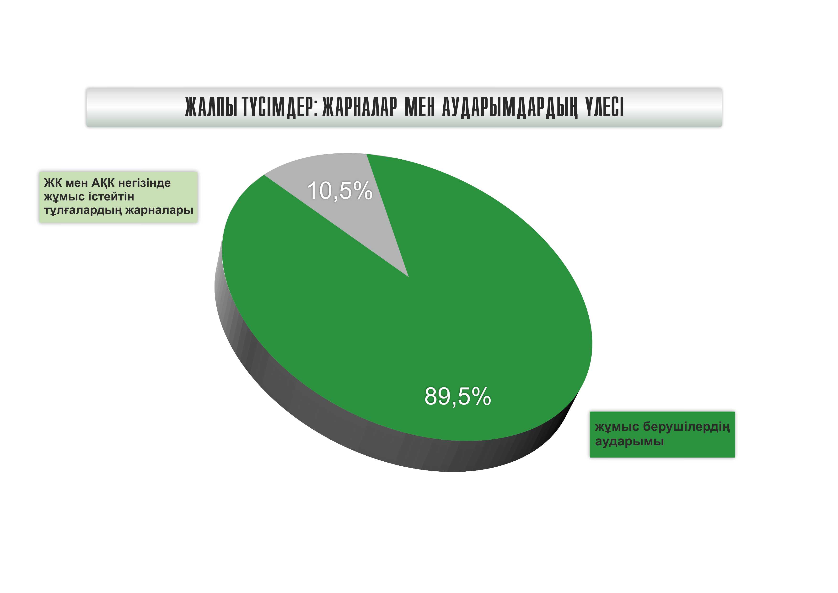 ونىڭ 72,1 ملرد تەڭگەسى (89,5% جۋىعى) جۇمىس بەرۋشىلەردىڭ قاراماعىنداعى جۇمىسكەرلەرى ءۇشىن جاساعان اۋدارىمدارى بولسا, قالعان 8,5 ملرد تەڭگە (10,5% جۋىعى) – جەكە كاسىپكەرلەر مەن ازاماتتىق-قۇقىقتىق كەلىسىمشارت نەگىزىندە ەڭبەك ەتەتىن تۇلعالارعا تيەسىلى.