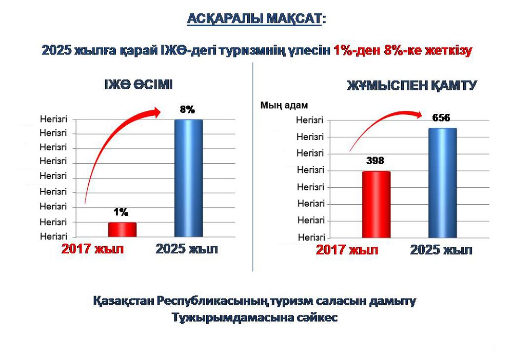 – 2023 جىلدارعا قاراي ءبىز تۋريستەر اعىنىن 2 ميلليون ادامعا جەتكىزۋدى كوزدەپ وتىرمىز. بۇعان قوسا ىشكى ءتۋريزمدى 500 مىڭ ادامنان 2 ميلليون ادامعا, ياعني ءتورت ەسەگە ارتتىرۋعا كۇش سالامىز, – دەدى ۇكىمەت باسشىسىنىڭ ورىنباسارى.
