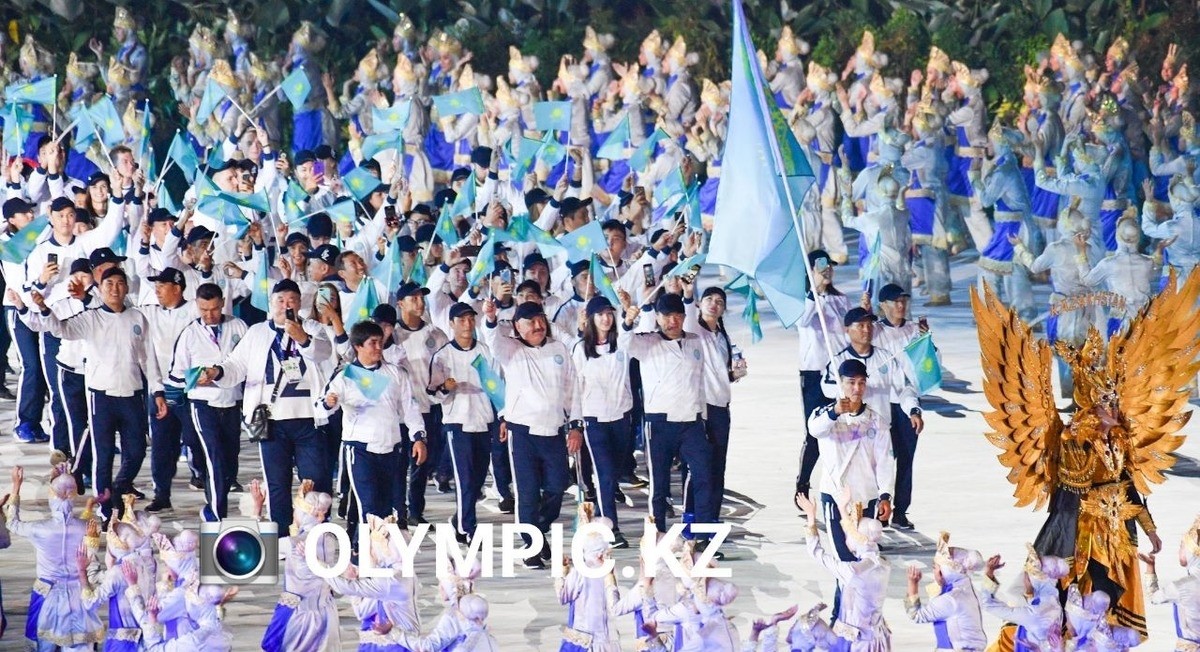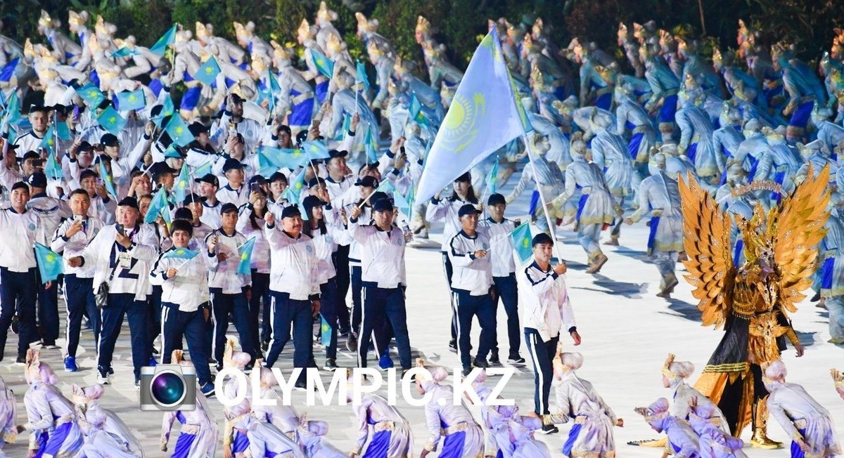وسىدان كەيىن جارىسقا قاتىساتىن ەلدەردىڭ سپورتشىلارى ساپ تۇزەپ, كەزەك-كەزەگىمەن ستاديوننىڭ الاڭىن اينالىپ ءجۇرىپ ءوتتى. ءبىزدىڭ ەلدىڭ دەلەگاتسياسى 15-ءشى بولىپ شىقتى. ال مەملەكەتتىك تۋىمىزدى بوكستان الەم چەمپيوناتىنىڭ كۇمىس جۇلدەگەرى امانقۇل ءابىلحان ۇستاپ ءجۇردى. وسىدان ءتورت جىل بۇرىن وڭتۇستىك كورەيانىڭ ينچحون قالاسىندا وتكەن ازيادادا بوكستان وليمپيا ويىندارى جəنە əلەم چەمپيوناتىنىڭ كۇمىس جۇلدەگەرى Əدىلبەك نيازىمبەتوۆ الىپ جۇرگەن-ءدى. وسىلايشا, قاتارىنان ەكى ازيا ويىندارىندا كوك تۋىمىزدى ۇستاپ شىعۋ بوكسشىلارىمىزعا بۇيىرىپ وتىر.