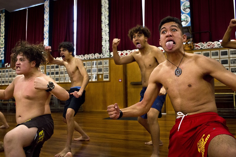 دەۆيد موريس سميت, «نيۋ-يورك تايمس». گيسبورن ۇلدار مەكتەبىنىڭ وقۋشىلارىنىڭ باسىم بولىگى ماوري تايپاسىنان تاراعان. ولار سوعىس ءبيى – «حاكا» ورىنداپ جاتىر.