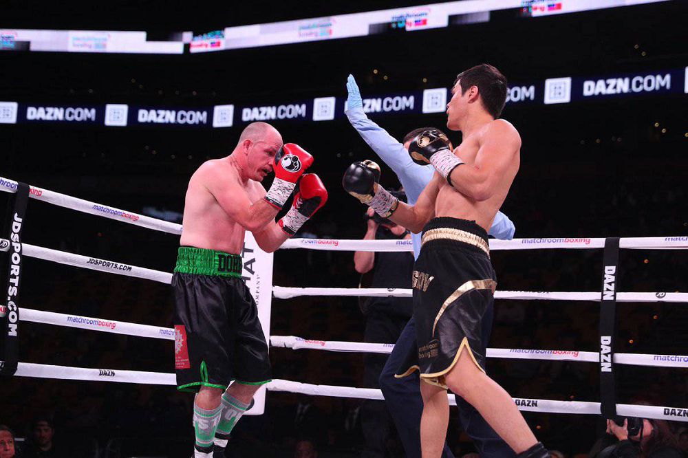 ەلەۋسىنوۆ پەن دوگەرتي اراسىنداعى جەكپە-جەك التى راۋندقا جوسپارلانعان بولاتىن. الايدا ءبىرىنشى راۋندتىڭ اياقتالۋىنا 30 سەكۋند قالعاندا وتانداسىمىزدىڭ سەريالى سوققىسىنان كەيىن تورەشى ايقاستى توقتاتۋعا ءماجبۇر بولدى. جەكپە-جەك قورىتىندىسى بويىنشا دانيار تەحنيكالىق نوكاۋتپەن جەڭىسكە جەتتى. كەزدەسۋدەن كەيىن وتانداسىمىز الداعى جوسپارىمەن ءبولىستى. «مەن اۋەسقوي بوكستا الىس قاشىقتىقتا ءجۇرىپ جۇدىرىقتاسۋ ءۇشىن كوپ ەڭبەك ەتتىم. ال كاسىپقوي بوكستاعى باپكەرىم دجون دەۆيد دجەكسون مەنى جاقىن جانە ورتا ارا قاشىقتىقتا جۇمىس ىستەۋدى ۇيرەتىپ جاتىر. قانداي جاعداي بولسىن تىنباي ەڭبەك ەتىپ, ۇلكەن جەكپە-جەكتەردە ءوزىمنىڭ مۇمكىندىگىمدى كورسەتۋىم كەرەك», دەدى ەلەۋسىنوۆ.
