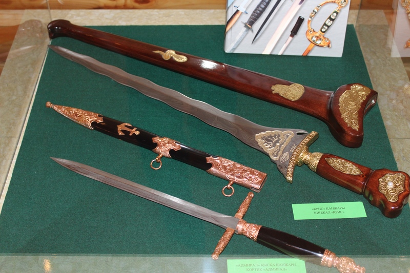 مۇسىلمانداردىڭ اتى اڭىزعا اينالعان باتىرى, يسلام دىنىندەگى وتە ءادىل حاليفالاردىڭ ءبىرى ازىرەت الىگە مۇحاممەد/ع.س.ع./پايعامبارىمىزدان مۇراعا قالعان ۇشى ايىر قىلىش-زۇلپىقاردى تاماشالاۋشىلار قاتارى قالىڭ. ەكى ءجۇزدى, ۇشى وتكىر, قىسقا ساپتى قارۋلار قۇرىشتان سوعىلعاندىقتان مىقتى. قاشقار, بالاساعۇن, شاش, وتىرار قالالارىنان قالعان جۇرناقتى, ەسكى جادىگەردى كوزگە ەلەستەتەدى. قايقى قىلىشتار, ۇزىندى-قىسقالى پىشاقتار, اسكەري اساتاياق, قولشوقپار جاسالۋ شەبەرلىگىمەن ەرەكشە سۇيسىندىرەدى.