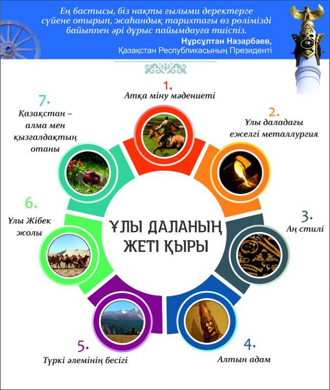 تاۋەلسىزدىك العان 27 جىل ىشىندە قازاقستان ۇلتتىق تاريxىن جۇيەلەۋگە, وتارلىق ساياساتتان ارشىپ الۋعا ءبىراز تالپىنىستار جاسادى. اۋەلى ءبىز «مادەني مۇرا» باعدارلاماسى ارقىلى تاريxي ەسكەرتكىشتەردى قالپىنا كەلتىرىپ, قۇندى جادىگەرلەردى جيناقتاپ جۇيەلەدىك, تاريxي تەوريالىق ءبىراز ماسەلەلەرىمىزدى شەشىپ الدىق. بىراق ەلباسىنىڭ جارىق كورگەن « ۇلى دالانىڭ جەتى قىرى» اتتى ماقالاسىندا كورسەتىلگەن ارنالى باعىتتار بىزدە بۇرىن-سوڭدى بولعان ەمەس.