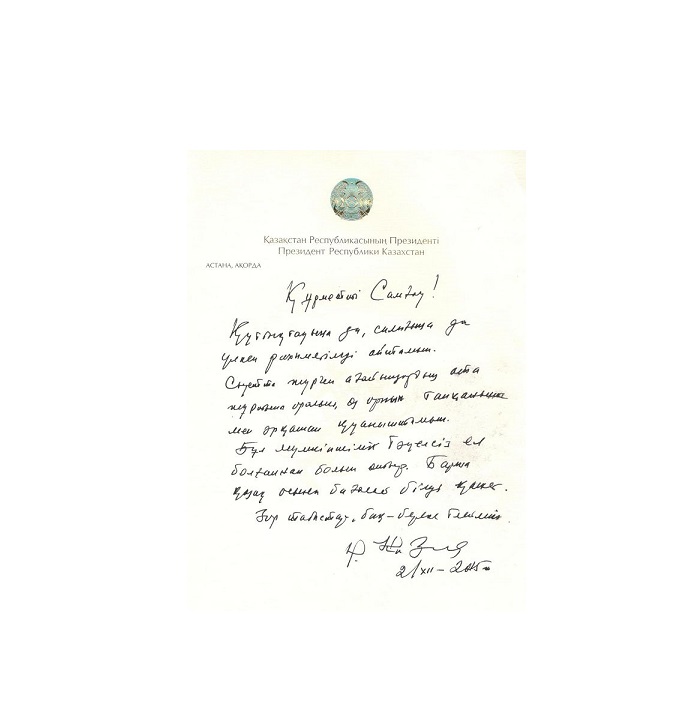 وزدەرىڭىز كورىپ وتىرعانداي, ەلباسى ءوزىنىڭ ءىلتيپات حاتىندا: سامعاۋ باۋىرىمىز جىبەرگەن سىيلىقتى قابىل العانىن ايتىپ, سىرتتا جۇرگەن اعايىندار اتاجۇرتقا ورالىپ, ورىن تاپقاندارىنا قۋانىشتى ەكەنىن جەتكىزە كەلە, مۇنىڭ ءبارى تاۋەلسىزدىكتىڭ ارقاسى ەكەنىن ەرەكشە ەسكەرتىپ, سىيلىق يەسىنە باق-بەرەكە تىلەپ, حاتتىڭ سوڭىنا «2 جەلتوقسان, 2015 ج.» دەگەن داتامەن قاتار ءوزىنىڭ قولىن قويىپتى.