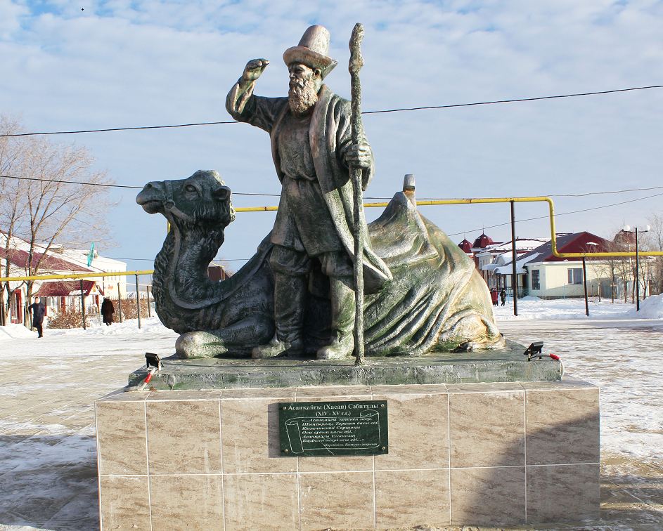 جەلماياسىن شوگەرىپ قويىپ جول قاراپ تۇرعان اسان بابا ەسكەرتكىشىنىڭ اۆتورى – قازاقستان سۋرەتشىلەر وداعىنىڭ مۇشەسى, ءمۇسىنشى يبراگيم ايدەنوۆ. ول ارىپتەستەرى احمەت ەرعاليەۆ جانە زاكيجان يسلامبەكوۆپەن بىرگە ءمۇسىندى ەكى اي ىشىندە جاساپ شىققان. ال اۋدان ورتالىعىنا كورىك بەرەتىن ماعىنالى ءمۇسىننىڭ باس دەمەۋشىسى – جەرگىلىكتى كاسىپكەر يۋسۋپ قازيەۆ ەكەن.