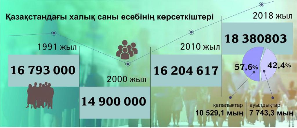 ستاتيستيكا كوميتەتىنىڭ دەموگرافيالىق جانە الەۋمەتتىك ستاتيستيكا باسقارماسىنىڭ باسشىسى گۇلميرا قاراۋىلوۆانىڭ ايتۋىنشا, قازاقستان حالقىنىڭ سانى بىلتىرعى كورسەتكىشكە قاراعاندا تاعى 44 مىڭداي ادامعا تولىققان. «احاج ورگاندارى ۇسىنعان ازاماتتىق حال اكتىلەرى جازبالارىنداعى مالىمەتتەردى وڭدەۋ ناتيجەسىندە, 2018 جىلعى قاڭتار-ماۋسىمدا تۋعاندار سانى 192,7 مىڭ ادامدى قۇرادى, بۇل 2017 جىلعى قاڭتار-ماۋسىمعا قاراعاندا 1,8%-عا كوپ. تۋدىڭ جالپى كوەففيتسيەنتى 1000 ادامعا 21,26 سابيدەن كەلەدى. بيىلعى رەسپۋبليكا حالقىنىڭ تابيعي ءوسىمى 2017 جىلعى قاڭتار-ماۋسىممەن سالىستىرعاندا 3,3 مىڭ ادامعا نەمەسە 2,7%-عا كوبەيىپ, 125,9 مىڭ ادامعا جەتتى. تابيعي ءوسىمنىڭ جالپى كوەففيتسيەنتى 1000 ادامعا شاققاندا 13,89 ادامدى قۇرادى», دەيدى گۇلميرا سايلاۋبەكقىزى.