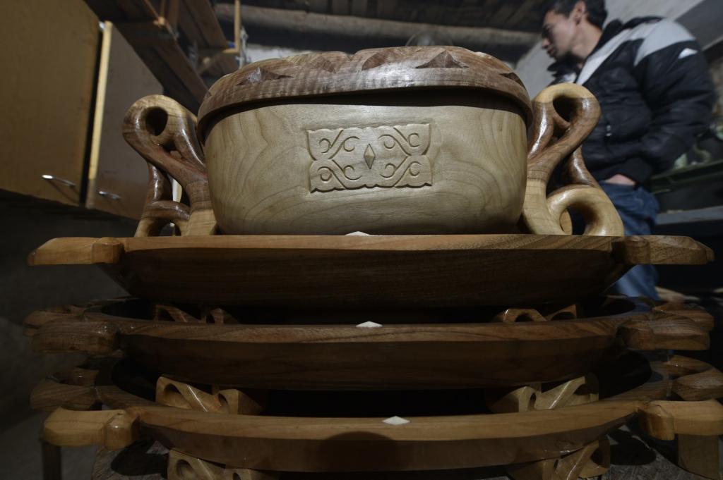 تاڭدا شەبەردىڭ قولىنان شىققان ۇلتتىق ناقىشتاعى ىدىس-اياقتارعا تاپسىرىس بەرۋشىلەردىڭ قاتارى كوپ كورىنەدى. اڭگىمەمىزدىڭ قىزدى-قىزۋىمەن شەبەرحاناعا الارمان كەلگەنىن بايقاماي قالىپپىز.