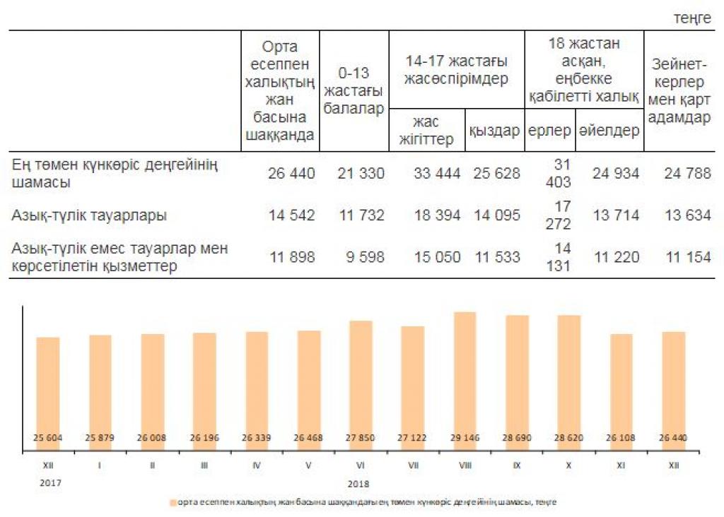 ەڭ تومەن كۇنكورىس دەڭگەيى – شاماسى بويىنشا ەڭ تومەن تۇتىنۋ سەبەتiنiڭ قۇنىنا تەڭ, ءبىر ادامعا ارنالعان ەڭ تومەن اقشالاي كiرiس. ەڭ تومەن تۇتىنۋ سەبەتi ادامنىڭ تىنىس-تىرشىلىگىن قامتاماسىز ەتۋ ءۇشىن قاجەتتى تاماق ونىمدەرىنىڭ, تاۋارلار مەن كورسەتىلەتىن يستيكا زاتتاي جانە قۇن تۇرىندەگى ەڭ تومەن جيناعىن بىلدىرەدى. ول ازىق-ت ۇلىك سەبەتىنەن جانە ازىق-ت ۇلىك ەمەس تاۋارلار مەن كورسەتىلەتىن قىزمەتتەرگە جۇمسالاتىن شىعىستاردىڭ تىركەلگەن ۇلەسىنەن تۇرادى. ەڭ تومەن كۇنكورىس دەڭگەيىن ەسەپتەۋگە ارنالعان از تۇتىنىلاتىن ازىق-ت ۇلىك ەمەس تاۋارلار مەن كورسەتىلەتىن قىزمەتتەرگە جۇمسالاتىن شىعىستاردىڭ ۇلەسى 2018 جىلعى 1 قاڭتاردان باستاپ ەڭ تومەنگى تۇتىنۋ سەبەتى قۇنىنىڭ 45 پايىزدىق مولشەرىندە بەلگىلەنگەن.