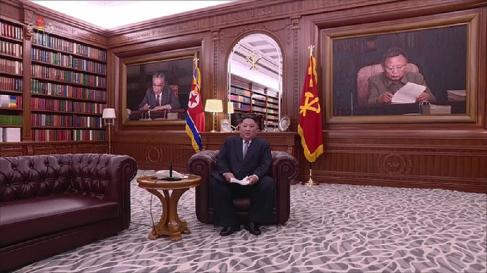 ول اتاسى كيم ير سەن مەن اكەسى كيم چەن ءيردىڭ سۋرەتى ىلىنگەن جەكە كابينەتىندە ديۆانعا وتىرىپ, بۇرىنعى ستيلدەگى كيىم ۇلگىسىن تاستاپ, باتىستىڭ ستيلىندە گالۋستۋك پەن كوستيۋم كيىپ, جاڭا جىلدىق قۇتتىقتاۋىن وتىز مينۋت بويى كىدىرمەي ايتىپ شىقتى. ادەتتە تۇرىپ سويلەيتىن كيم مىرزا بۇل جولى, ديۆانعا وتىرىپ, ەمىن-ەركىن قۇتتىقتاۋ جولدادى. ونىڭ بۇل جولعى قۇتتىقتاۋ سوزىنەن ەڭ ماڭىزدى باعىتتار بايقالدى. ءبىرىنشى, ەلدىڭ ەكونوميكالىق ءال-اۋقاتىنا باسىمدىق بەردى. ەكىنشى, حالىقارالىق قارىم-قاتىناس بويىنشا اقش جانە وڭتۇستىك كورەيامەن وتكىزگەن كەلىسسوزدەرگە توقتالدى. ءۇشىنشى, يادرولىق قارۋسىزدانۋ تۋرالى باعىت-باعدارعا قاتىستى, سولتۇستىك تاراپىنىڭ يادرولىق قارۋسىزدانۋعا دەگەن وزگەرمەس نيەتى مەن ۇستانىمدارىن مالىمدەدى. باسا نازار اۋداراتىن نارسە, ەگەر اقش سەكىلدى ەل ءوز ۋادەسىندە تۇرسا قارۋسىزداناتىندىعى, ەگەر ۋادەسىندە تۇرماي, ءتۇرلى سىلتاۋ تاۋىپ, باياعىشا حالىقارالىق قاۋىمداستىقتىڭ كومەگىمەن قىسىمدى ۇدەتەتىن بولسا, باسقا شىعار جولدى قاراستىراتىنىن قاداپ ايتتى. سونىمەن قاتار قوس كورەيانىڭ بىرجىلدىق قارىم-قاتىناسىنا قاتىستى باعا بەردى. 2018 جىلدى 70 جىلدىڭ ىشىندە ۇلكەن وزگەرىسكە بەت بۇرعان جىل دەپ, ەكى ەلدىڭ اراسىندا بولعان كەزدەسۋ ناتيجەسىنە قاناعاتتاناتىنىن جەتكىزدى. كورەي تۇبەگىن بەيبىتشىلىك تۇبەگىنە اينالدىرۋ, كەسون زاۋىتى مەن كىمگانسان تۋريستىك زوناسىن وڭتۇستىك تاراپتا يگەرۋگە بايلانىستى ۇسىنىس-ويىن ورتاعا سالدى. اسكەري سالا بويىنشا كورەي تۇبەگىن بەيبىتشىلىك الاڭى جاساۋ ءۇشىن ەكى ەلدىڭ اراسىنداعى اسكەري تەكەتىرەستى جۇمسارتۋعا دەگەن نيەتىندە وزگەرىستىڭ بولمايتىنىنا توقتالدى. اسكەري تەكەتىرەستى بولدىرماۋ ماقساتىندا امەريكا مەن وڭتۇستىك كورەيانىڭ اسكەري جاتتىعۋلارىن وتكىزبەۋدى جانە سىرتقى ستارەگيالىق كۇشتەردى تۇبەككە اكەلمەۋ جانە ەنگىزبەۋگە اسا ءمان بەرىپ سويلەدى. تۇبەكتىڭ بەيبىتشىلىگى ءۇشىن, ونىڭ جاعدايىنا قاتىستى ەلدەرمەن دە كوپجاقتى كەلىسسوزدەردى وتكىزەتىندىگىن ءبىلدىردى.