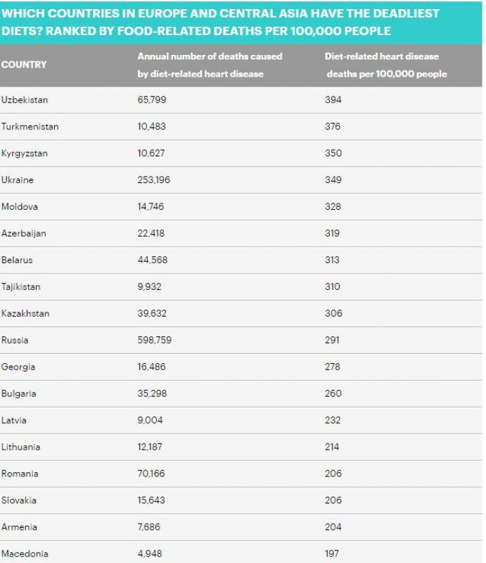 زەرتتەۋشىلەر شىعىس ەۋروپا, رەسەي جانە ورتالىق ازيا ەلدەرىن, سونداي-اق گەرمانيانى – دۇرىس تاماقتانباۋ سالدارىنان ءولىم كوپ بولاتىن ەلدەر قاتارىنا جاتقىزدى.