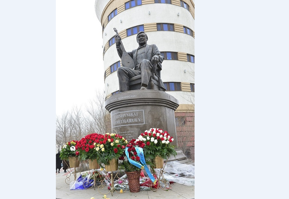 دومبىراسىن قولىنا الىپ تۇعىرعا قونعان كۇيشى ەسكەرتكىشى – قر مادەنيەت قايراتكەرى, ءمۇسىنشى ەدىگە راحماديەۆتىڭ جۇمىسى. «قازاقستان» قوناق ءۇيىنىڭ جانىنان ورىن العان ەسكەرتكىشتىڭ بيىكتىگى 3,5 مەتر.