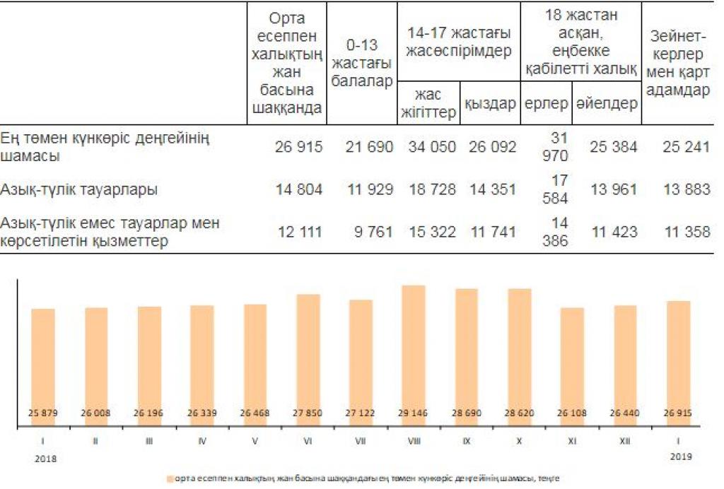 نەگىزگى تاماق ونىمدەرىن تۇتىنۋدىڭ ەڭ تومەنگى نورمالارىنان ەسەپتەلگەن ورتا ەسەپپەن حالىقتىڭجان باسىنا شاققانداعى ەڭ تومەن كۇنكورىس دەڭگەيىنىڭ شاماسى 2019 جىلعى قاڭتاردا 2018 جىلعى جەلتوقسانمەن سالىستىرعاندا 1,8%-عا جوعارىلادى. ونىڭ قۇرىلىمىندا ەت پەن بالىقتى ساتىپ الۋعا جۇمسالعان شىعىستاردىڭ ۇلەسى – 20,5%, ءسۇت, توڭ ماي ونىمدەرى مەن جۇمىرتقانى – 16,5%, جەمىستەر مەن كوكونىستەردى – 8,3%, نان جانە جارما ونىمدەرىن – 7,5%, قانت, شاي جانە دامدەۋىشتەردى 2,2%-دى قۇرادى.