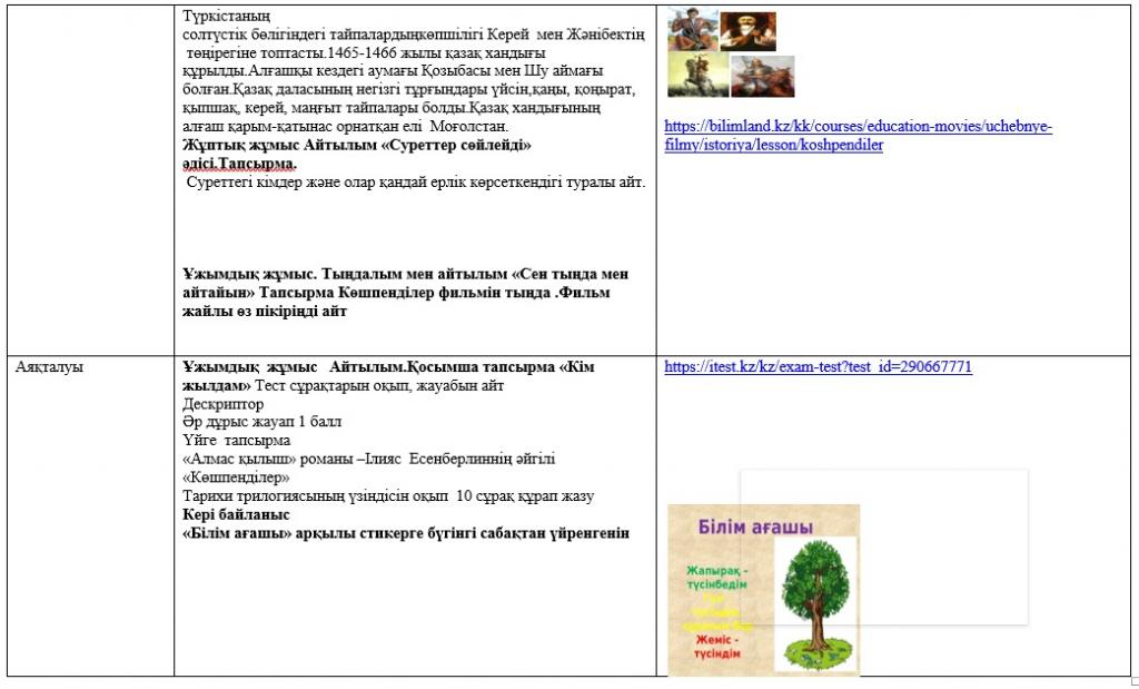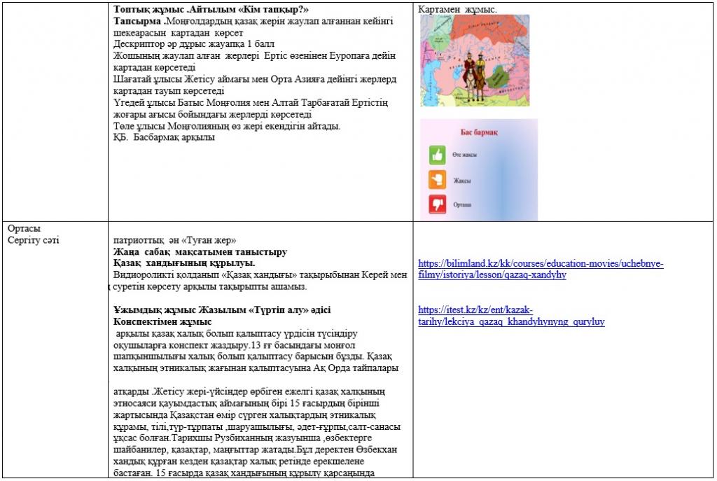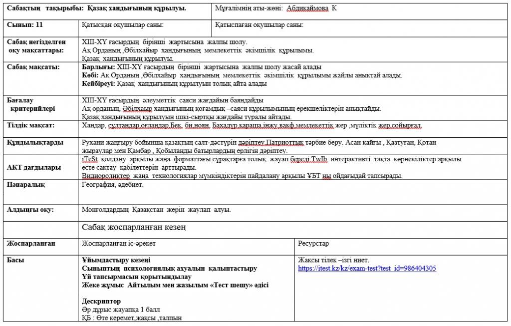 وقۋشى ءوز ماقساتىن ايقىنداي وتىرىپ, پروبلەمانى شەشۋگە ارەكەتتەنەدى, ءبىلىمدى جەتە مەڭگەرۋ ءۇشىن ءوزىنىڭ بارلىق ىسكەرلىگىن پايدالانادى. قازاقستان رەسپۋبليكاسىنىڭ ازاماتى ەلىنىڭ ەرتەڭگى بولاشاعى قانداي بولاتىنىنا جاۋاپتى. ء وزى ءومىر ءسۇرىپ وتىرعان قوعامدى ءارى قاراي دامىتۋ ونىڭ مىندەتى جانە پارىزى. ولاي بولسا, ءاربىر وقۋشىنىڭ ءوز وتانىنىڭ تاريحىن ءبىلۋى اسا ماڭىزدى. قورىتىندى اتتەستاتتاۋ مەن ۇبت عا دايىندىق بارىسىندا «قازاق حاندىعىنىڭ قۇرىلۋى» تاقىرىبىندا جاڭا ءادىس-تاسىلدەردى پايدالانىپ ساباق جوسپارىن جاسادىم. ءوز ويىمدى باسقالارمەن ءبولىسۋدى ءجون كوردىم.