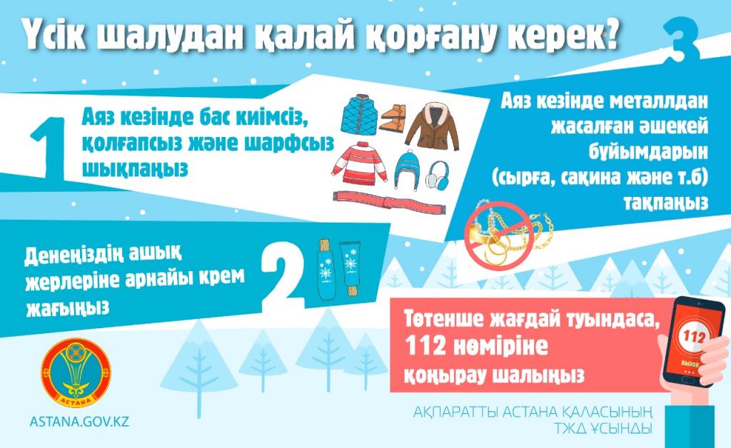 كوبىنەسە قورعالماعان قول, بەت, قۇلاق ۇسىككە شالىنادى. «ۇسىكتەن قورعانۋ ماقساتىندا كەڭ جانە جىلى كيىنگەن ءجون. اياق كيىم كەڭ بولعانى جاقسى, ەگەر باقايلارىڭىز اياقكيىم باسىنا ءتيىپ تۇرسا, اۋا اينالمايدى دا, اياعىڭىز توڭىپ, ءۇسىپ كەتۋى مۇمكىن. جانە سۋ وتكىزبەيتىن, تابانى قالىڭ اياق كيىم كيگەن ابزال. ايازدا تەمىر, كۇمىس, التىن اشەكەيلەر تاقپاعان دۇرىس. قۇلاق پەن بەتىڭىزدى مىندەتتى تۇردە جاۋىپ ءجۇرىڭىز. مۇرىن تەز توڭىپ, ءۇسىپ كەتۋى مۇمكىن. قاتتى سۋىقتا تەك مۇرىنمەن دەمالىڭىز» دەپ كەڭەس بەرەدى استانا قالاسى قوعامدىق دەنساۋلىق ساقتاۋ باسقارماسى.