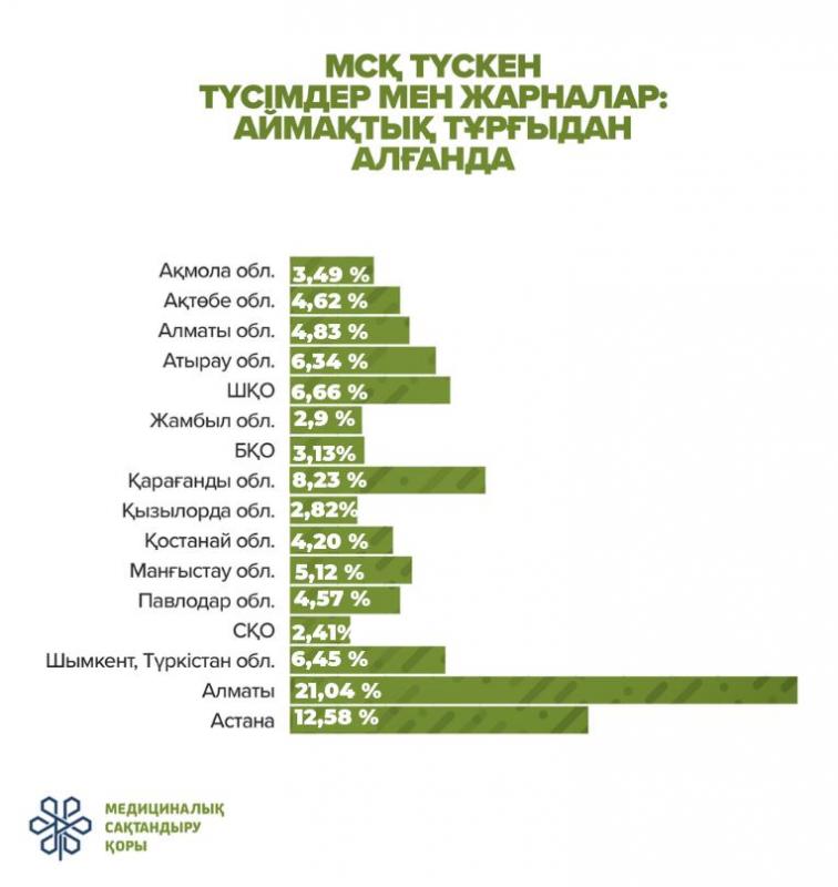 جالپى, ايماقتىق تۇرعىدان العاندا, استانا (12,58%) مەديتسينالىق ساقتاندىرۋ جارنالارى - اۋدارىمدارى بويىنشا الماتى قالاسىنان (21,04%) كەيىن ەكىنشى ورىندا, ءۇشىنشى ورىندا - قاراعاندى وبلىسى (8,23%).